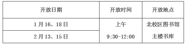 三、寒假期间,各阅览室、自习室、南校区书刊借阅室停止开放。